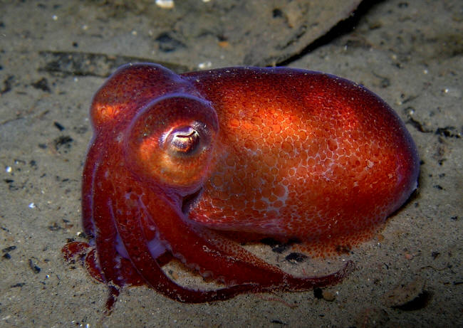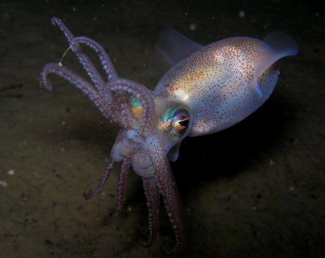 Natdykket ved Alsbek var fint, det var blevet helt stille og vandet var blankt at lyset fra den anden side af fjorden spejlede sig i det. Så snart det var mørkt (2230) var det bare om at komme i og jagte blæksprutter. Først ned af skrænten på det dybe og se på jomfruhummer, søfjer og søpenne det hele var fremme.