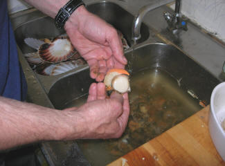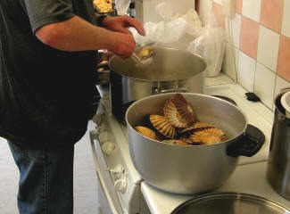 Der var kommet lidt mere vind men ikke noget der gav problemer, Kim var hurtigt klar og jeg lige efter og hurtigt ned mod bankerne. Det blev hurtigt klart ar der var kammuslinger, men ikke så mange som de sidste år. Indsamlingen begyndte og ikke længe efter var Kim væk (eller jeg og skæret) og jeg tog resten af turen i ro og mag alene alene rundt om skæret. Det blev til lidt over en halv pose fuld. Så sammen med hvad de andre og Kim havde fanget skulle der være nok til forretten. Sjovt var det at se fodspor ude på bunden og ja de passede til Lis svømmefødder. I havnen blev bådene trukket på land og kaptajnen tog den traditionelle Lysekil dukkert ved slæbestedet.