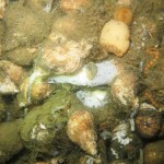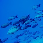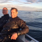 Jeg mødte kl 17:00 som aftalt, men Thomas, Rune og, selvfølgelig, Allan lå allerede klar ved den lille bro, hvor vi kan lange grejet ned i båden. Det tog ikke mange øjeblikke at tømme min bil, og vi sejlede kort efter. Vejret var ok med lidt vind fra vest og lidt strøm fra nordlig retning. Men inden vi vidste Af det, sådan ca. en times tid, var vi over Robert og fik smidt loddet. Thomas, som skulle binde på, trak loddet op igen, da Allan ikke var 100 % sikker på at loddet lå rigtigt. Da han havde halet loddet op, smed vi det igen, og denne gang fik Thomas lov til at binde på. Herefter kom Rune i vandet, og efter yderligere lidt tid, kom også Allan i havet. Imens var Thomas og Rune igen kommet op, og jeg kunne ligeledes hoppe i havet.
