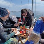 Regnen stod ned i stænger sammen med vind i kulingstyrke. Kim ringede ved middagstid og kunne berette om, at regnen var holdt op, der hvor han var. Jo – der var lidt sol mellem skyerne, der hvor jeg var, men også regn og rusk. Havde set lidt på sejlerudsigten og farvandsudsigten. Her så det ud til at vejret ville arte sig – i hvert fald ved 21-tiden 😀 Nu skal man jo aldrig helt stole på prognoser, så vi tog chancen – dykkes skal der!!! Gøre sig færdig på arbejde og af sted til Farum og fylde Kims og min egen flaske. Kim kom lidt i 17.30 så vi kunne komme af sted 17.34, til vores vanlige kirke parkeringsplads i Birkerød. Hvorefter resten af ture foregik i Kim bil. Dog var der ikke noget kaffe i dag, så vi måtte nøjes med en cola og hygge sluder.