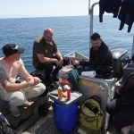 SMS UndineNu er vi nogen der godt kan lide at stå tidligt op, eller i hvert tilfælde, komme tidligt af sted. Så mødetiden var kl. 06.30 i Kastrup, hvor vi samlede os i to biler. Kim snakkede mit højre øre af og Michelle sad godt klemt ind mellem et par gæster fra Dykkerforum, Nikolaj og Ludvig, i deres kassevogn. Vejret var noget uldent, dvs. ingen vind, men tågen lå ret tykt over det ganske land. Det var dog helt befriende at rigge båd til i overskyet/tåget vejr, men når det så er sagt, så havde de jo lovet havblik og høj sol og det ville vi gerne have lidt af til de 21 mil ud til Undine.Det blev faktisk en halvkølig fornøjelse, men så snart vi tog farten af, så kom varmen og det tog heller ikke lang tid før vi klagede over, at det var for varmt. Vi fik smidt bøjen og Kim blev valgt til at binde på og jeg til at binde af, så de andre dykkede i mellem. Der var en del Undinedebut, så de skulle have lov til at få max udbytte. Uden at sætte mit lys under en skæppe, så var jeg ret sikker på at loddet lå omkring den forreste kanon og sagde til de andre, at der nok var bundet på i kanonen og gav derfor en hurtig briefing, om hvad og hvor der kunne forventes, at være hvor jeg sagde det var:-) Lowrance sonaren er simpelthen et perfekt værktøj og når man kender vraget godt i forvejen, er billedet let at tolke og man kan tydeligt se kanonerne på sonarbilledet.