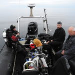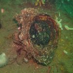 Trykkerdammen. Trods tropehede – eller måske nærmere derfor -var der ikke den store tilslutning til tirsdagsdykket. Enden på det hele blev, at Jeppe, Dennis og undertegnede måtte en tur i Trykkerdammen, selvom der var moderat østlig vind og lyst til noget andet.Vi var helt alene ved Trykkerdammen. Alle andre var åbenbart på ferie, så vi fik de bedste parkeringspladser ved trappen, gjorde klar og hoppede i det helt flade og tilsyneladende klare vand. Temperaturen var 19 °C, og sigten på det lave var 4-5 meter. Der var lidt strøm, og den tiltog med dybden. Til gengæld blev sigten så tilsvarende dårligere. Faktisk så dårlig, at Dennis blev væk. Det var jo ikke os, der var væk, for vi vidste jo lige præcis, hvor vi var. Dennis kunne huske sine rutiner, søgte kort tid på bunden og gik til overfladen, som reglerne foreskriver, men de regler plejer jeg ikke at bruge, så han måtte klare sig selv, hvilket han også gjorde.
