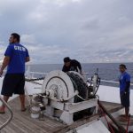 Da jeg kom et kvarter efter officiel mødetid, var jeg allerede forberedt på at skrivetjansen ville lande på mit bord og ganske rigtigt, fremme på havnen var de øvrige gaster (Allan, Kasper, Kim) og kaptajnen kommet og ventede blot på, at formanden fik hentet et kort til bommen (Eftersom vores klub-kort på mystisk hvis ikke var på sin plads).Med høj hastighed og vanlig tilskyndelse af kaptajnen fik vi læsset båden, og vi kunne stå ud af havnen relativt kort efter ankomst. Vel ude kunne vi konstatere at den opklaring, som var lovet af DMI var knapt så klar, men selv på et par sømil kunne man ane skibenes omrids, så kunne de vel også se os. Kaptajnen havde allerede på forhånd klargjort lod og tovværk, så det var blot at smide det over bord, så snart vraget var lokaliseret. Der var en smule uorden i linen på vejen ned, og kaptajnen måtte lige kontrollere en ekstra gang, at det lå som det skulle, eftersom han selv havde tilbudt at binde på. Han blev smidt oven på bøjen og væk var han.