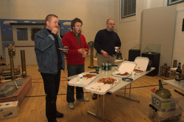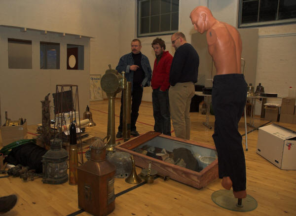 Vel ankommet, fik vi lige en hurtig øl med Svenskerne fra Stockholm og Varberg, inden vi læssede af. Bare ved at åbne bagdøren til herlighederne kunne vi imponere dem, det tegnede godt. Vi brugte nu det meste af aftenen til at finde ud af hvor og hvordan vi skulle fremvise vores fund – og så selvfølgelig få det sat op. Mens vi tre andre havde travlt, skaffede Manley både øl og pizzaer i rigelige mængder, det var herligt og vi nåede næsten at blive helt færdige, inden alarmerne blev slået til og vi skulle forlade stedet. Vi måtte derfor fortsætte det efterhånden muntre drikkelag i Jans lejlighed, få hundrede meter fra ”Remisen”.
