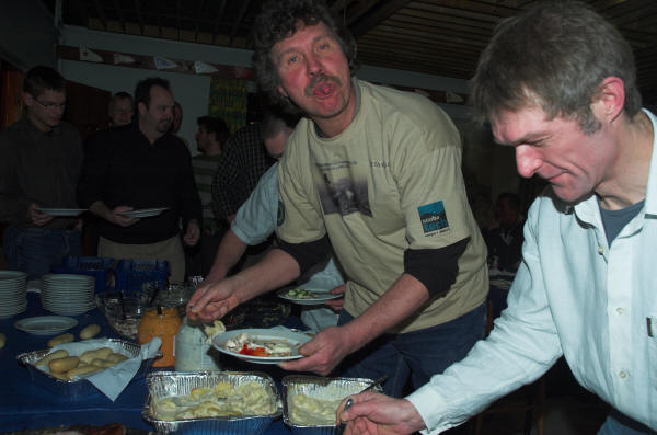Så var det endelig tid til pattegrisen, perfekt tilberedt på grillen og det udmærkede, men knappe tilbehør af flødekartofler og salat. Øl, vin og sprut var der til gengæld masser af, alle mente at de skyldte en omgang for et eller andet og stemningen var høj og kammeratlig.