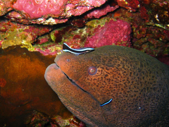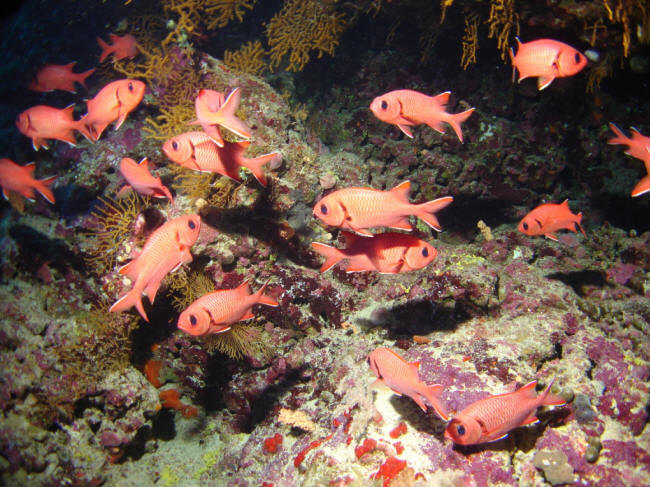 Vi så også papegøjefisk i deres slimsoveposer, fjerstjerner, rokker, skildpadde og muræner, og en stime fisk med lysende, reflekterende øjne, og alt det almindelige, så humøret var mærkbart bedre, end da vi gyngede på turen fra Elphinstone. Der var dog et par ”overspringere”- havet og Elphinstone havde krævet de første ofre!