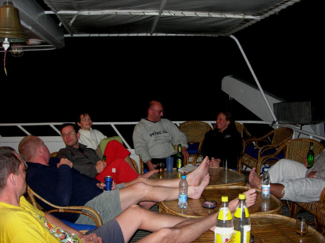 Så var der GT på dækket, for vi skulle være fulde for at kunne sove natten igennem på turen til Brothers. Bølgerne havde ikke lagt sig, og vi sejlede mod dem. Kaptajnen (vores medbragte) var dog ved godt mod. Hans lykkepiller virkede stadigvæk. Efter et par GT’er, med autentisk tonic, blev det sengetid for de fleste