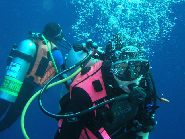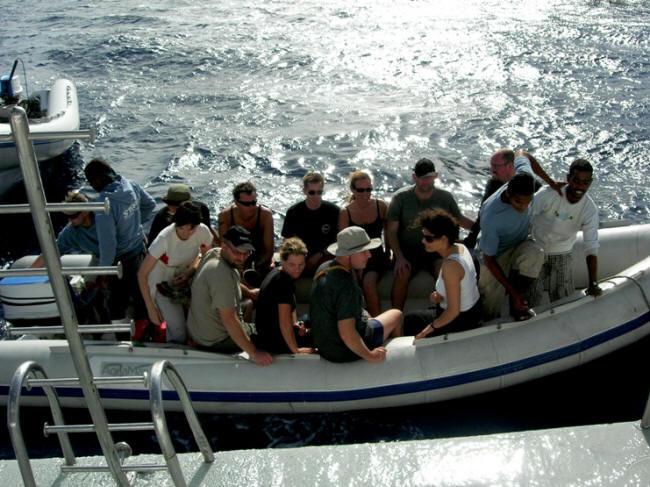 Da de fleste var kommet op skulle Marianne og Flemming lige hentes Det lykkedes bådføreren at vikle snoren fra deres dekobøje omkring skrue og motor på gummibåden, så han ikke kunne manøvrere. Heldigvis var der to gummibåde, og det var heldigt for den uheldige bådfører. Marianne var ikke helt tilfreds med hans præstation, og ”den uheldige” var heldig ved at være i den anden båd! Lis jublede, ikke at det var noget nyt, men hun havde set en skildpadde, og det havde hun glædet sig til, lige siden hun bestilte rejsen.