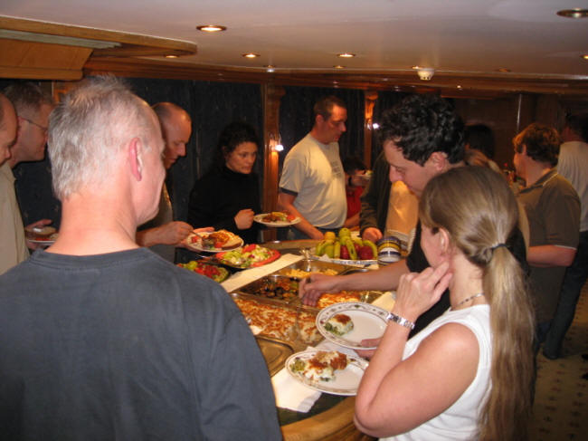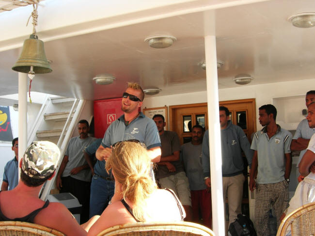 Vores diveguide Theijs, en hollænder med sjovt hår, gav os en kort introduktion og tjekkede vores certifikater. Det var meget uformelt, og der skulle kun skrives under på, at vi selv var skyld i det hele. Kort efter blev middagen serveret. Under maden skulle kvajedyret uddeles. Hummeren var ikke med, men et andet dyr med stor betydning for mange af deltagerne, et egern, var indkøbt som stand-in hos fætteren. Thomas stod for seancen, og udnævnte Gobo til turens første dyrepasser. Mest fordi han havde grinet af stakkels Mads, da han smadrede en flaske gin på gulvet i lufthavnen, for derefter selv at smadre en flaske whisky et øjeblik senere. (også lidt for at whisky ikke er godt med tonic).