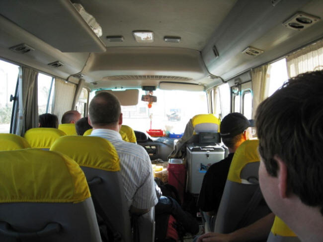 Vi blev derefter fordelt i to busser og kørte mod Marsa Alam. Vores unge chauffør holdt en høj hastighed på hele turen, og han havde ikke noget imod at køre i venstre side, så han kunne snakke med den anden buschauffør. Dem der kunne køre stærkt nok til at overhale tog den ind mellem busserne, og når der kom modkørende, så var det mest synd for dem selv. Men der var heldigvis god plads i rabatten. Vi stoppede hos den samme fætter, hvor vi altid holder tisse/kaffepause på vejen sydpå, og han havde stadigvæk ikke gjort rent på toilettet. Til sidst på køreturen var der lidt uenighed mellem de 2 buschauffører om hvor båden lå, eller i hvert fald om hvordan man kom dertil. Den sidste kilometer var ind gennem en byggeplads, hvor vejen ikke var nem at se. Vi ankom dog til Port Ghalip, som var den dieselstinkende havn, hvor vi skulle tilbringe den første nat på Hurricane.