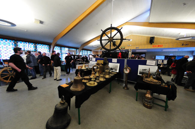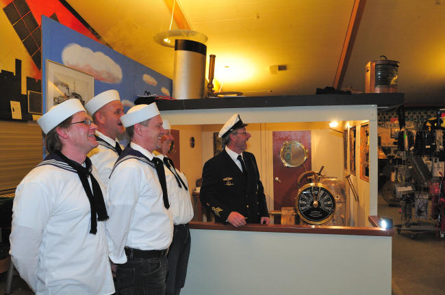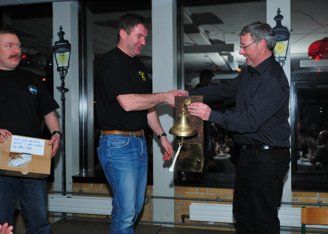 Der var også andre der skulle hædres, og 4 specielt udvalgte effekter fra udstillingen blev fremhævet. Lars fra Sønderborg havde et eller andet klenodie i messing, som han holdt så godt fast i, at man ikke kunne se hvad det var, Ole fra Middelfart havde et gammelt messingmikroskop, Thomas, på hjemmebane, havde en smuk sabel fra 1. verdenskrig og Kasper (også på hjemmebane) havde den mest nypudsede klokke på hele udstillingen! Gutterne blev fotograferet med klenodierne og en letpåklædt quinde, som det jo hører sig til på store udstillinger. Og sjovt, som de før så bramfrie gutter – nu ikke barmfrie - blev mundlamme, røde i hovedet og bevægelseshæmmede. Seancen blev senere afsluttet med en serveringsrunde i salen, hvor de fleste fik mulighed for at nærstudere de seneste landvindinger inden for kunststoffer og kirurgisk anvendelse heraf.