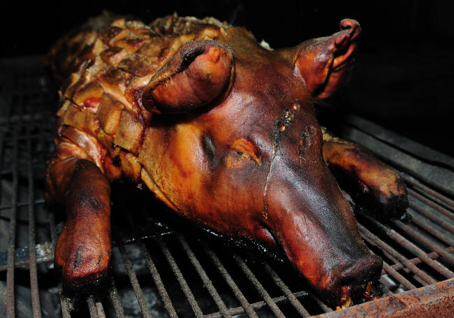 Efter udstillingen var det tid til fest. Hele dagen havde en pattegris (ikke den mindste model) ligget på grillen, og den var nu klar til at være en del af menuen. Forretten var krebs, hovedretten det hele svin og desserten islagkage. Og der var nok af det meste! Krebsene viste sig at være en udfordring for nogle af deltagerne, der ikke var så rutinerede i omgangen med dyrene, men hva’! Flûtes og dressing stiller jo den værste sult! Nu var det jo en fordel at have prøvet det før, og Havbasserne havde fået styr på det gennem det seneste år, men specielt vores svenske gæster havde håndelaget! Det var vist noget med ”arv og miljø”!