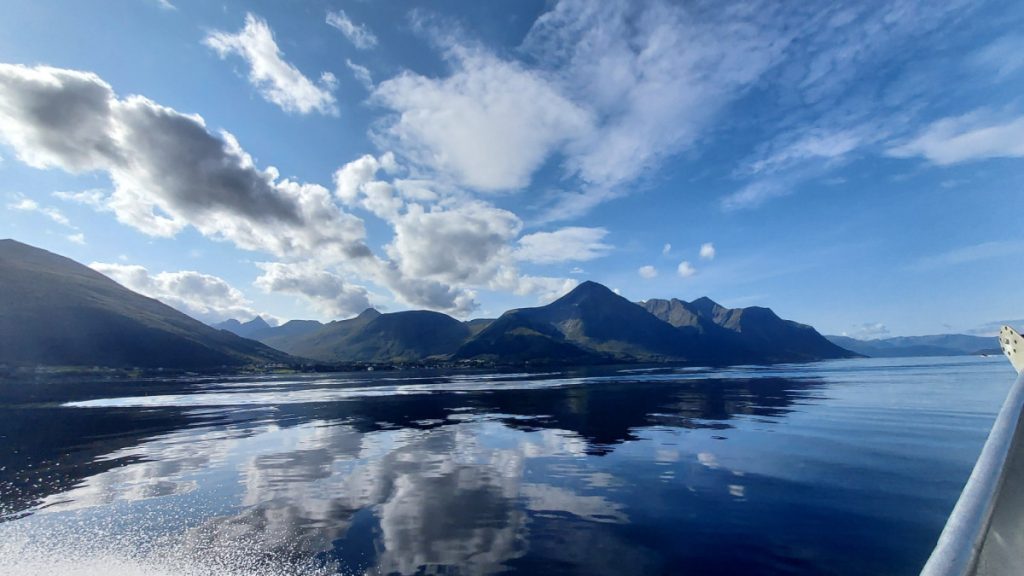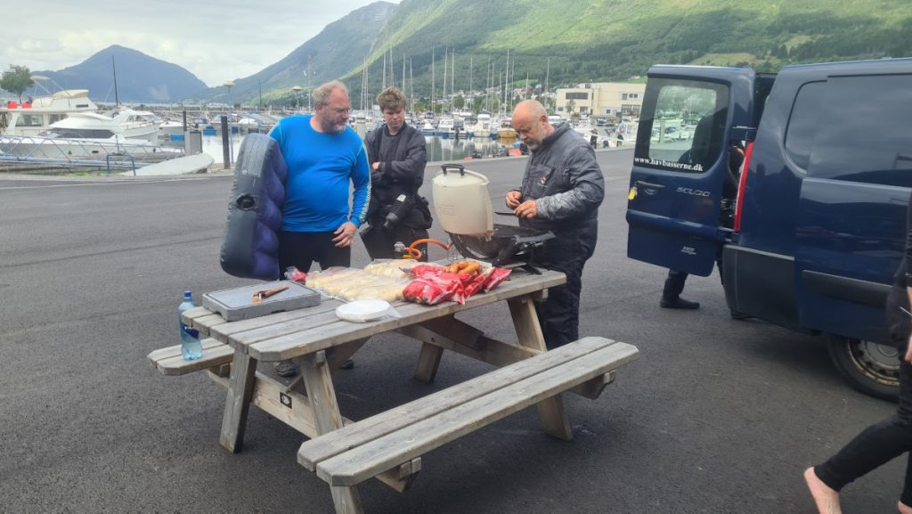 Havkassen og Klaus’ bil blev sendt afsted med forsyninger (mad og ekstra flaskesæt) og Havbassernes Flåde stævnede ud i et sjældent set godt vejr. Vi fik en fantastisk sejltur over blanke fjorde – med kik til tinderne og de spredte sneklatter.