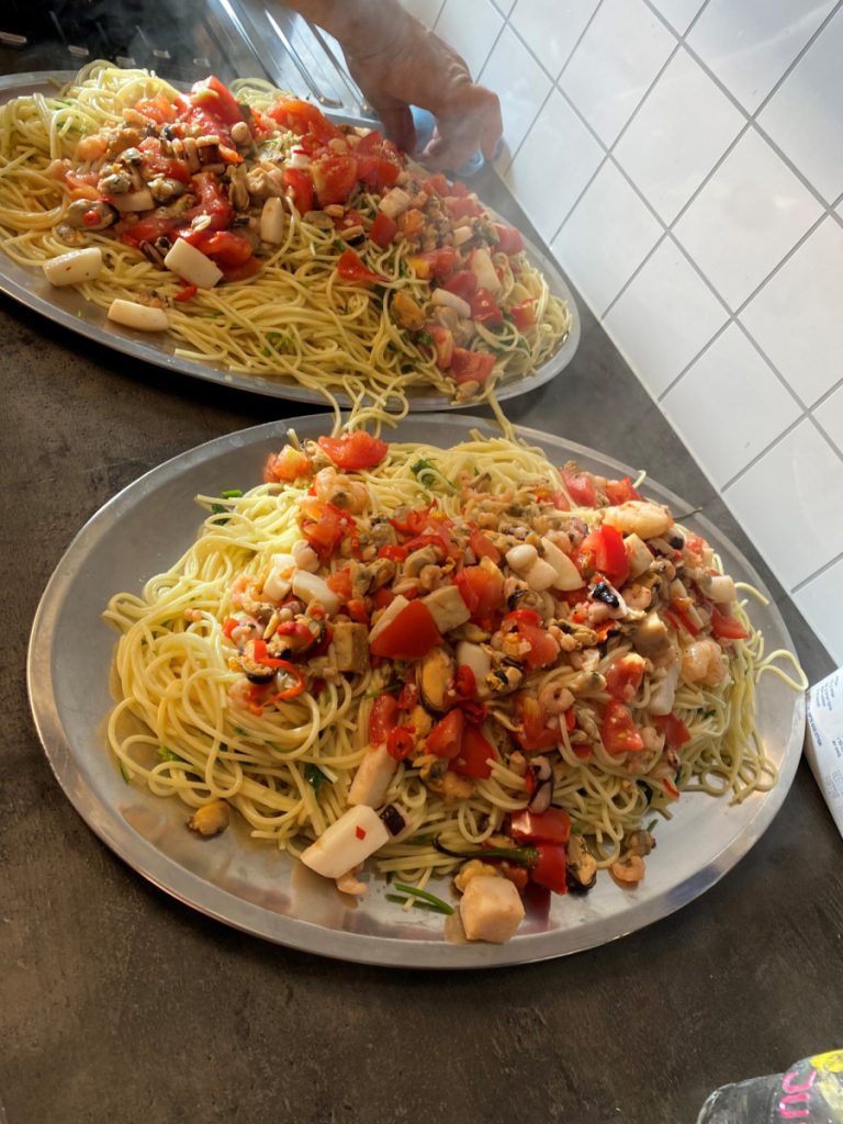 Tilbage til huset og have mad. Juhl fik bikset noget seafood sammen med noget spaghetti .