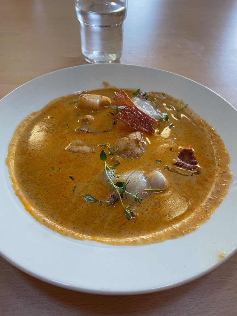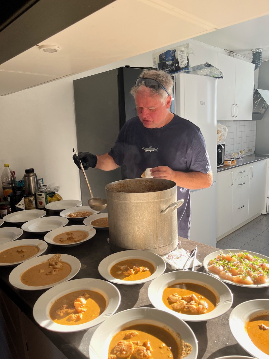 Aftensmaden bestod af Jans krabbebisque med pocheret fisk og islagkage – og efterfølgende natdyk på Kveiteskær.