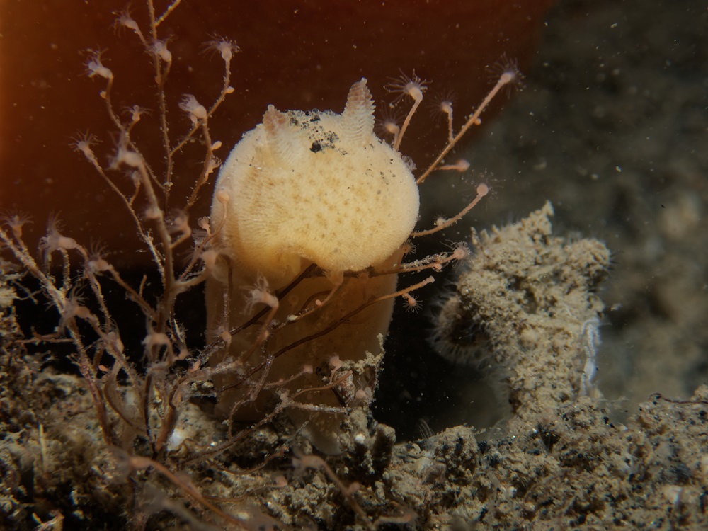 Vandet var nogenlunde fladt, men der var dog bølger fra ret store forbigående skibe. Loddet (og Kasper) blev smidt, og efter 3 min kom flåddet i overfladen, og alle ccr dykkere kunne hoppe i,når nu der var bundet på så de ikke fik stress og andre unskyldninger; jeg skulle binde af for Kasper havde bundet på. Vi var de eneste oc’er ud over Kim, men som tiderne dog skifter.