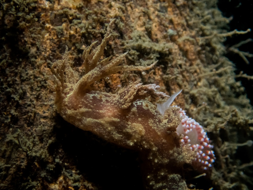 Næste stop var Cementprammen, Gøg og Gokke gik selvfølgelig i gang igen, men det lykkedes igen i første forsøg. Peter rullede i igen for at binde på. Vi ventede, ventede og ventede, men ingenting skete. Kenneth rykkede lidt utålmodigt i linen og der kom et par modryk. Vi ventede lidt længere og efter et kvarter kom bøjen op. Eskil kom i vandet og jeg fulgte hurtigt efter. Lige som på første dyk var sigten ikke noget at råbe hurra for, men det var til at finde rundt, og der var igen massere af nøgensnegle. Jeg gik selv i gang med at shoppe pilkelodder, hvilket der var rigeligt muligheder for.