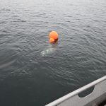 Jeg mødte kl 17:00 som aftalt, men Thomas, Rune og, selvfølgelig, Allan lå allerede klar ved den lille bro, hvor vi kan lange grejet ned i båden. Det tog ikke mange øjeblikke at tømme min bil, og vi sejlede kort efter. Vejret var ok med lidt vind fra vest og lidt strøm fra nordlig retning. Men inden vi vidste Af det, sådan ca. en times tid, var vi over Robert og fik smidt loddet. Thomas, som skulle binde på, trak loddet op igen, da Allan ikke var 100 % sikker på at loddet lå rigtigt. Da han havde halet loddet op, smed vi det igen, og denne gang fik Thomas lov til at binde på. Herefter kom Rune i vandet, og efter yderligere lidt tid, kom også Allan i havet. Imens var Thomas og Rune igen kommet op, og jeg kunne ligeledes hoppe i havet.