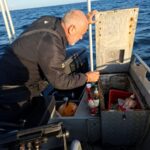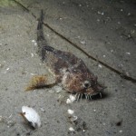 Jeg mødte kl 17:00 som aftalt, men Thomas, Rune og, selvfølgelig, Allan lå allerede klar ved den lille bro, hvor vi kan lange grejet ned i båden. Det tog ikke mange øjeblikke at tømme min bil, og vi sejlede kort efter. Vejret var ok med lidt vind fra vest og lidt strøm fra nordlig retning. Men inden vi vidste Af det, sådan ca. en times tid, var vi over Robert og fik smidt loddet. Thomas, som skulle binde på, trak loddet op igen, da Allan ikke var 100 % sikker på at loddet lå rigtigt. Da han havde halet loddet op, smed vi det igen, og denne gang fik Thomas lov til at binde på. Herefter kom Rune i vandet, og efter yderligere lidt tid, kom også Allan i havet. Imens var Thomas og Rune igen kommet op, og jeg kunne ligeledes hoppe i havet.