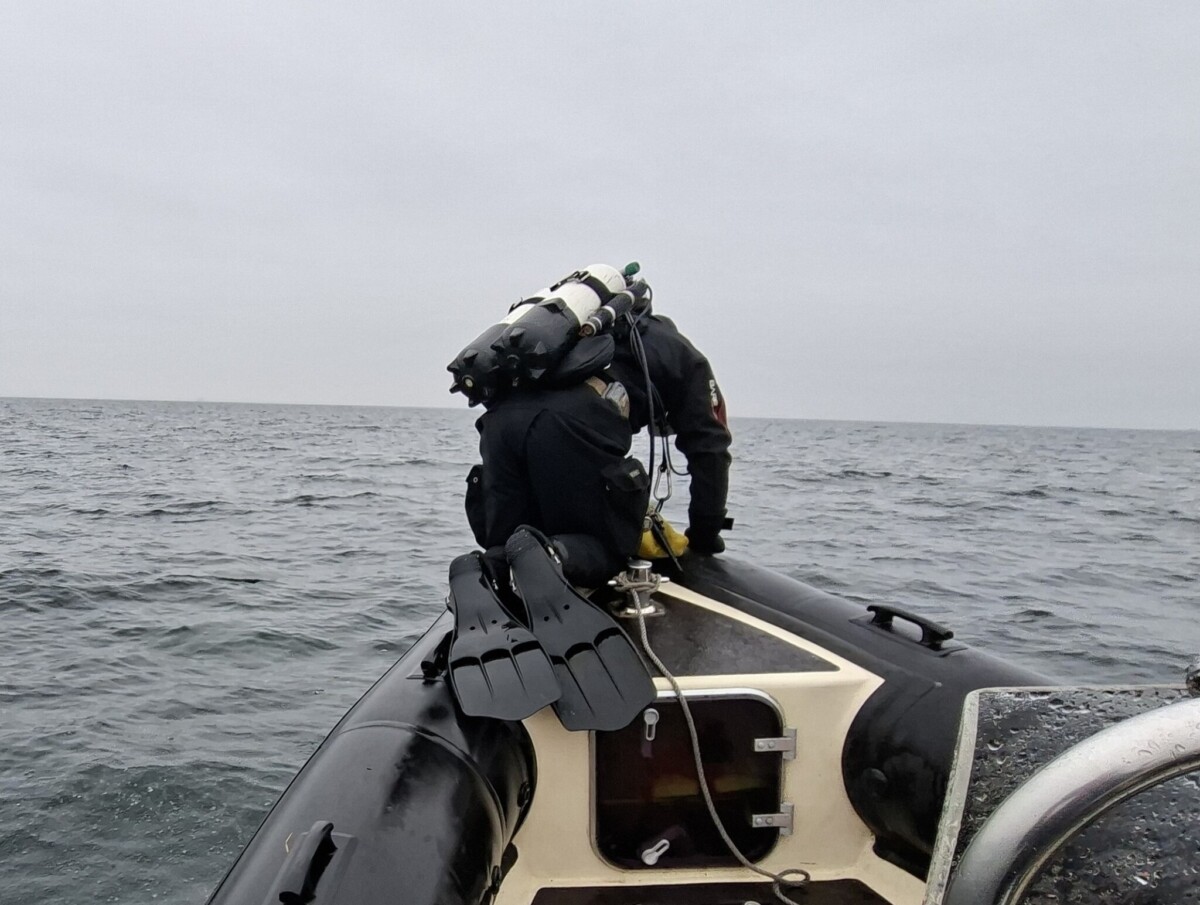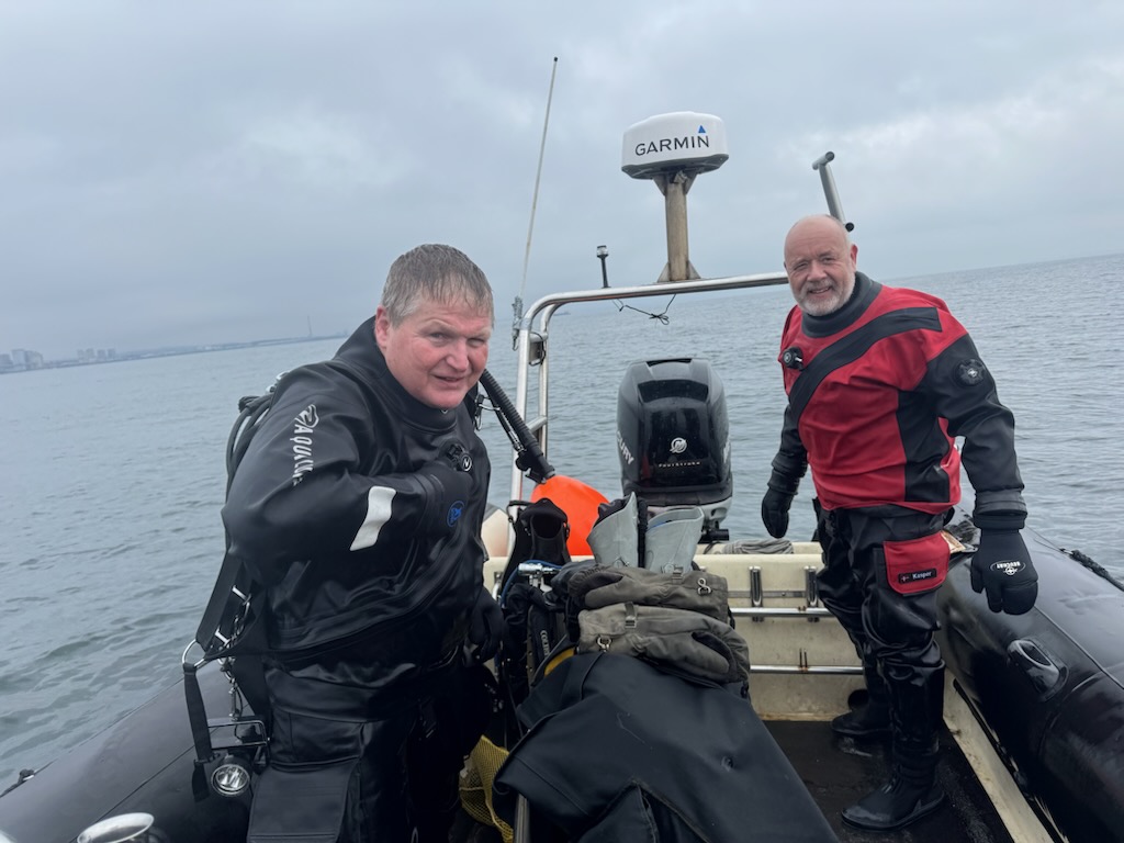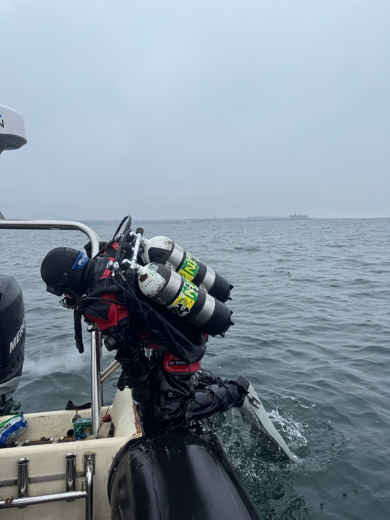 Her virkede strømmen meget blidere og vi fik smidt bøjen i. Alt så rimeligt ud og kort efter kom Kasper i. Han var retur i overfladen efter ca. 5 minutter, og vi tænkte at loddet var kastet dårligt. Kasper havde bundet på, men kunne godt tænke sig at have bly og lygte med på resten af dykket 😊