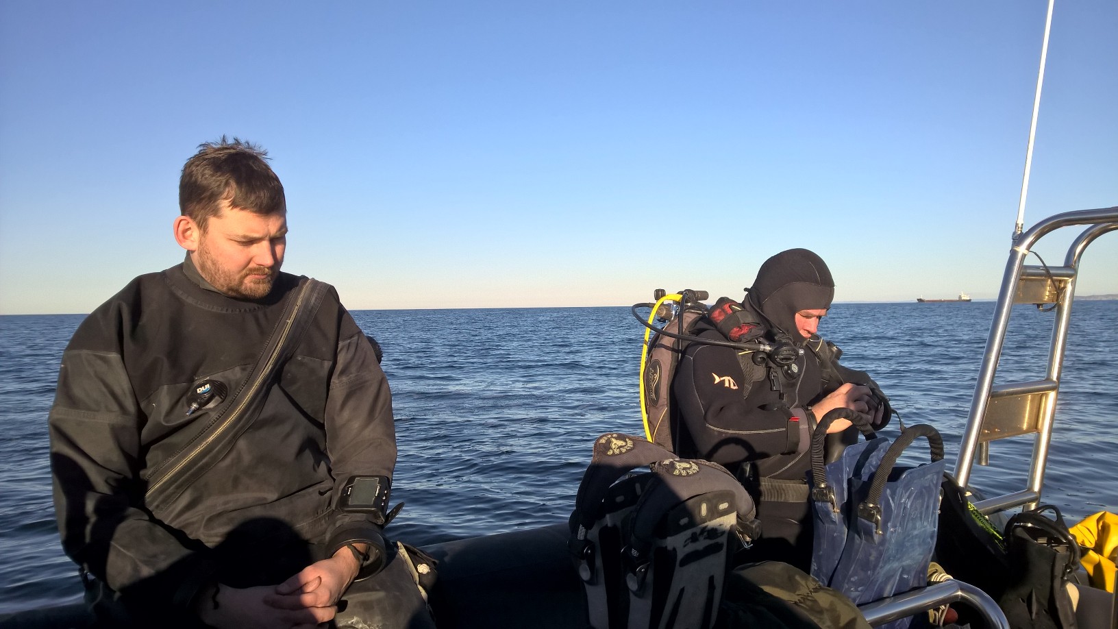 Vi nåede positionen og dræget blev hurtigt smidt. I med Lille Jensen som fik lov at binde på som vanligt. Nu er det jo et lille vrag, og vi var 8 der skulle dykke, så jeg meldte mig helt frivilligt til at binde af og lod pænt de andre slås om rækkefølgen. Det gik fint, også som vanligt, med diverse våde tørhandsker m.m. Heldigvis lykkedes det mig at vælte Kims pose med bl.a. Underberg, og var derfor nødsaget til at drikke dem, der faldt ud, sammen med de ca. 5 liter kaffe nogen havde taget med. Og da jeg havde rigtig god tid, var det bare om at nyde det og suge den smule varme ud af solen, der trods alt var :-))
