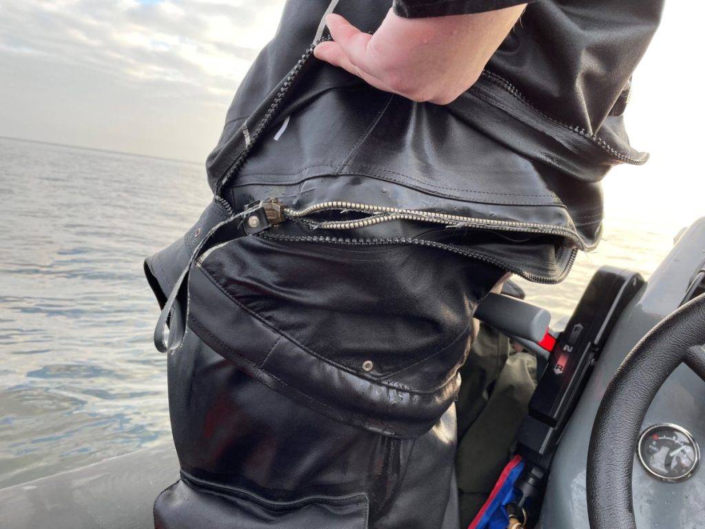 Kim var næsvis og blev derfor idømt at binde på. Han baksede lidt med sin lynlås og hoppede efter bøjen. Men sjældent har jeg da set nogen forsøge at komme så hurtigt op igen. Vi skulle lige have monteret stigen, så han fik lov at hænge lidt, inden han kom op og afslørede en helt flækket lynlås og et par bordfyldte støvler.
