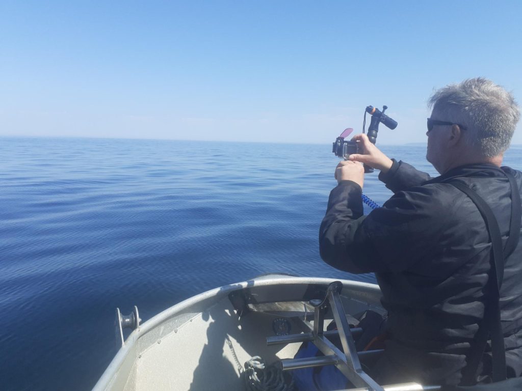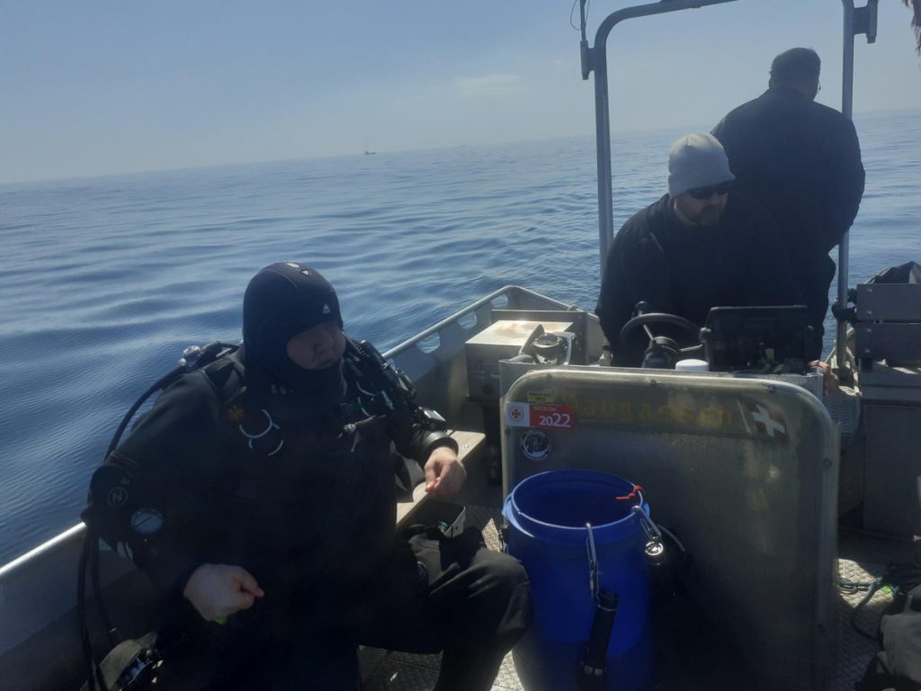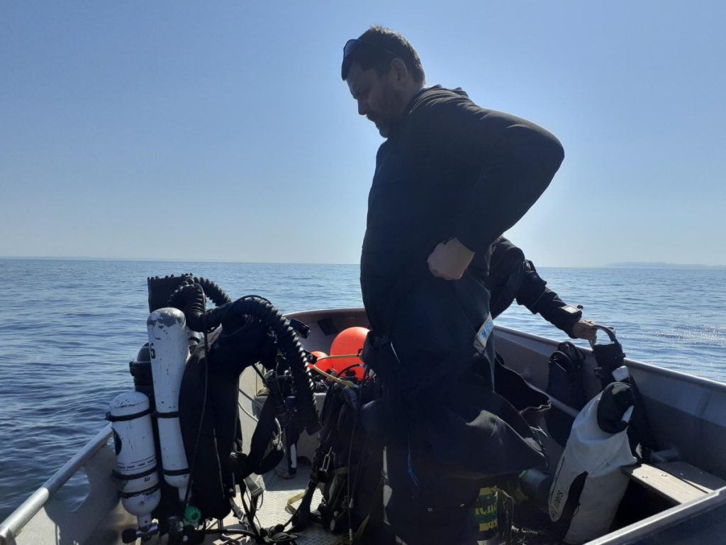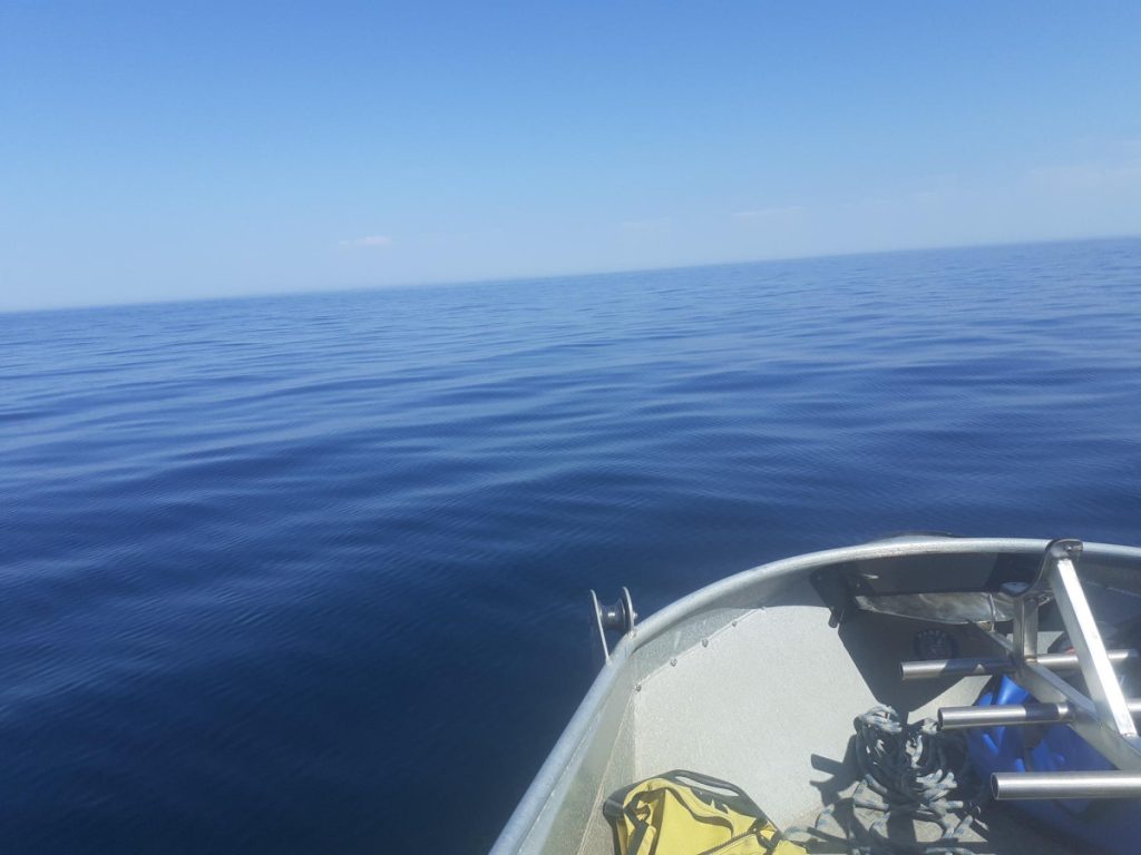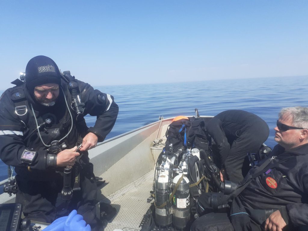 Tilbage til overfladen, hvor alle var kommet i overfladen. Til trods for de forskellige afstikkere var dykningen afviklet relativt hurtigt, og da det stadig var super godt vejr, blev det besluttet at tage dyk nr. 3 på vraget af ”Mirs”. Behøver næppe nogen nærmere præsentation, men bare lige for at sætte vrag-findingen lidt i relief, så er vraget næppe meget højere end 1 meter med undtagelse af styrhuset som fylder 4 m² og stikker 2,5 meter op….ikke meget at søge efter. Men det tog nu ikke Steffen mere end 10 sekunder at slå vraget og yderligere 2 at få smidt loddet. Kim og jeg valgte at være overflademandskab. Thomas og Kasper skulle bevise at de kunne finde tilbage til bundtovet og Steffen skulle bare i vandet. Alle op samme sted med oplysning om fornuftig sigt og rent faktisk også et par småtorsk og 3 taskekrabber.