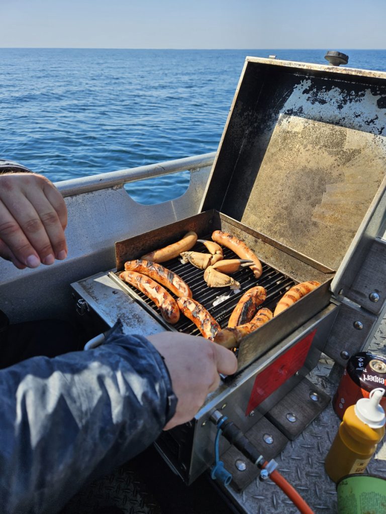 Alle i overfladen og med Kasper ved grillen blev det en fin og hyggelig frokost. Næste mål var vraget ”S.S. Bygdøy” som kunne nås med 20 min sejlads. Igen var Thomas første mand i vandet. Nu udstyret med en lygte der kunne lyse. Relativ hurtig påbinding og Kasper kunne følge efter. Herefter det sædvanlige cirkus med ”dykkermaskiner” der skal rigges til og ledninger til alt muligt og umuligt elektrisk inde- og uden for dragten. Og det var stadig varmt. Endnu engang tog det tid og det var så nu ”tæt på nr. 2” kom til overfladen. Det var denne gang Kasper der havde valgt en fri opstigning og ”landede” ca. 100 meter fra båden. Steffen måtte derfor vente med at komme i vandet, indtil vi fik hentet Kasper. Denne gang kunne søforklaringen reduceres til, at en eller anden havde bundet på mit inde i vraget på det dybeste sted og tilmed støvet…….så siger vi det.