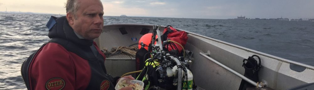 Rutinerne kørte og bum, så blev loddet smidt på Otto. Jeg hoppede i, der var let strøm og et lod som ikke var landet på vraget. Den lange slæbelinje i mudderet på bundet var for lang til at blive svømmet op.
