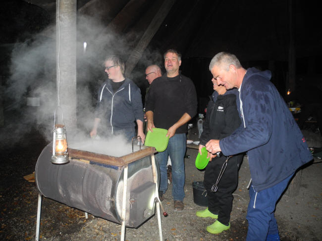 Furesøen biologisk og gastronomisk vurdering af krebsebestanden.Så var dagen kommet, hvor dragterne skulle skylles i ferskvand, og Furesøen skulle endevendes og krebsene evalueres. Vejrguderne var ikke helt med på den idé, der var en noget frisk vind, der kun lagde sig, når regnen høvlede ned. Der var booket plads ved Naturskolen, så vi kunne komme ind under teltet ved bålpladsen, og der var også en eller anden venlig Havbasse, der havde suppleret med en presenning, så forholdene var ok, selv om de godt kunne have været bedre.