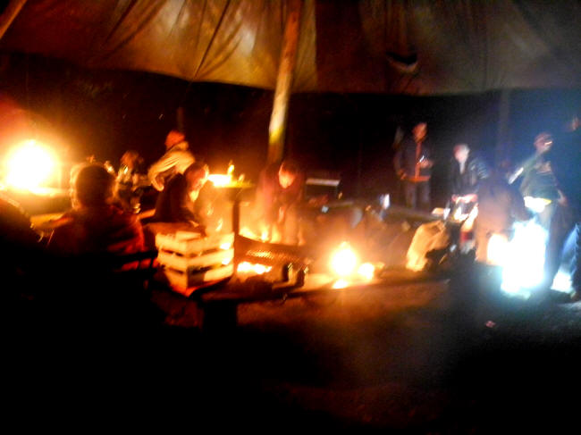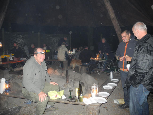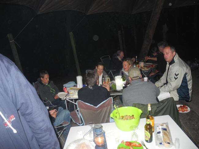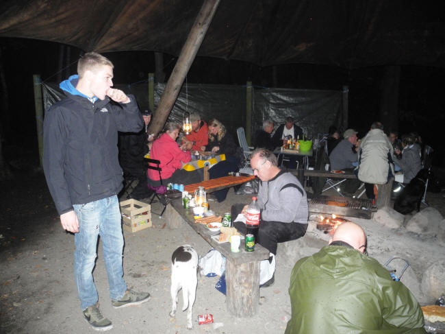 Men, det var jo ikke kun tunge videnskabelige pligter hele tiden, vi skulle jo også hygge os, og det gjorde vi så i læ under det store telt. Selv om det regnede ind imellem, så var der en tør plads til alle under teltet. Og aftenen var lun, så vi kunne fint hygge os aftenen igennem, og der var endda flere, der havde indkvarteret sig i shelterne for natten.