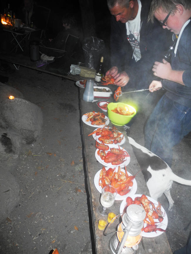 Man kunne godt fornemme, at vi var lidt senere på den i år, det blev bælgmørkt stort set inden middagen gik i gang, og endda til trods for, at vi ikke skulle vente længe på at krebsene blev tilberedt. Det tjept med at koge de krebs, der skulle evalueres nærmere. Det solide kogekar kunne snildt følge med, og bestanden af kogte krebs var af den helt rigtige størrelse