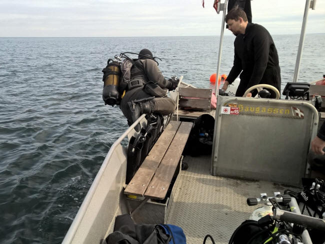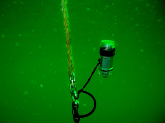 Undertegnede fik fornøjelsen af påbindingen og hoppede i havet. I overfladen var sigten ret dårlig, men fra 5-6 meters dybde klarede det op med ikke under 10 meter sigt. Jeg så de øverste strukturer fra vraget allerede fra 14-15 meters dybde og glædede mig til endelig at få ordentlig sigt, men ak, sigten nede på vraget var under en meter- ja nok under en halv! Der var nærmest slået en streg på 22,5 meters dybde, alt under var koldt, mælket og uklart, oppeover var vandet varmt og klart.