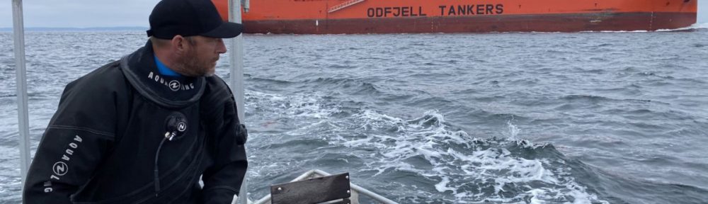 Ca. 5 minutter senere var han i overfladen, da loddet var blevet revet af. Vi diskuterede hurtig om vi skulle finde et andet mål, men Kim havde mod på et forsøg mere, så loddet blev kastet igen (i hullet midt i vraget, så lod og kæde kunne fange noget. red.), og Kim fulgte efter med så stor iver, at han næsten glemte at tage finner på, og med ca. 1 knob strøm syntes vi det var god stil at minde ham om dette 😉