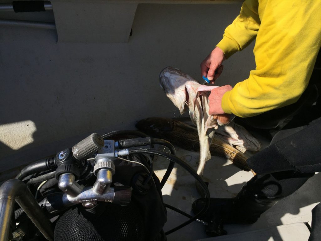 Oppe i båden var humøret højt i det gode vejr. Efter lidt tid dukkede Allan op med sækken fyldt og kunne fortælle, at han ikke fik bundet ordentligt af bl.a. fordi han var ved at løbe tør for luft efter de mange ture frem og tilbage tilbage bundtovet.