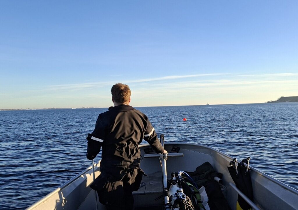 Vi fik smidt loddet og gjort Steffen klar. I med ham og så vente på at flåddet ville dukke op. Men det kom ikke og da der var gået et kvarter, begyndte vi at gøre Martin klar til at hoppe i og hjælpe, men så var der bobler omkring bundtovet.