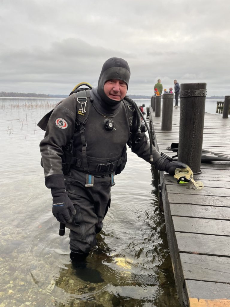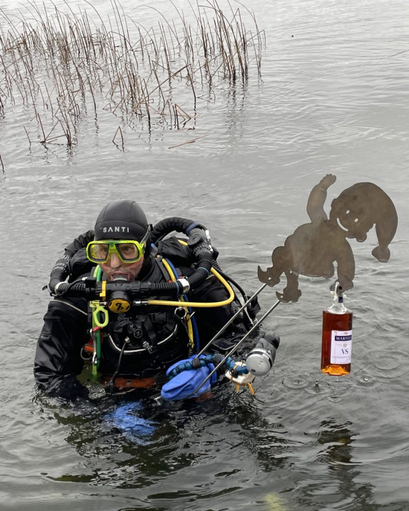 Vejret var mildt og klamt, ikke regnvejr men noget fugtigt. Vi var nok 35 stykker inklusive børn, men eksklusive hunde. Desværre var der ikke mange, der dykkede, så det var med en vis nervøsitet at arrangementskomitéen så dykkerne komme op med uforrettet sag. Men julen var lidt som i gamle dage, Manley dykkede og det er jo efterhånden et par dage siden, at vi har haft ham med på tur. Sidste mand i vandet kom også tomhændet tilbage til broen, men fik meget præcise anvisninger på, hvor cognacen nok var at finde.