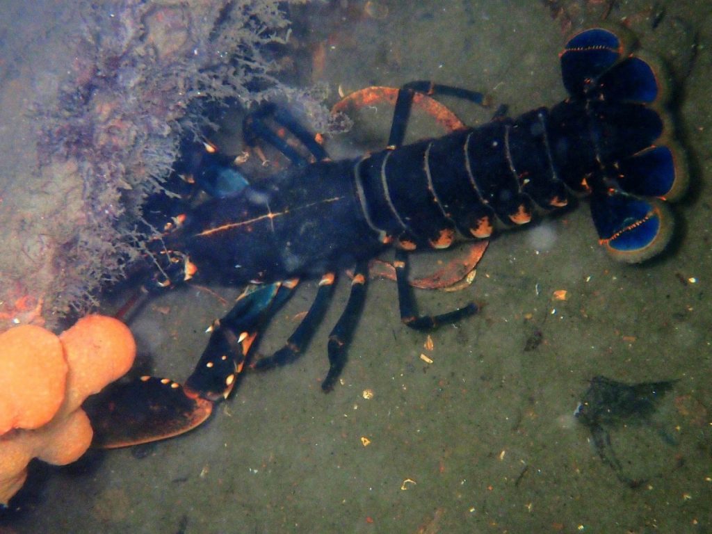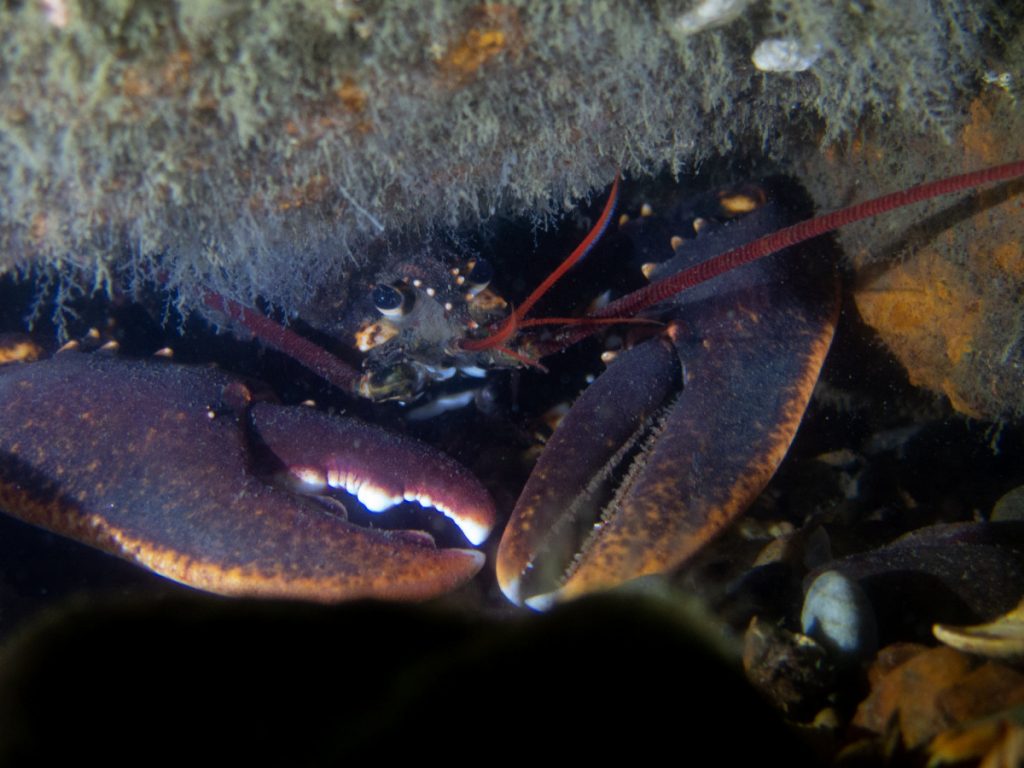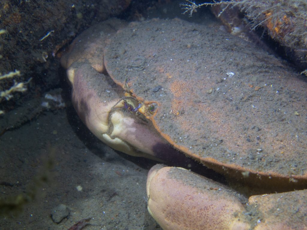 Da det blev min tur kunne jeg konstatere at sigten her var noget bedre – og jeg gik straks på jagt efter de mange hummere som vi stødte på i sidste uge samme sted… På vejen stødte jeg dog først på den dynamiske duo som lå og vendte verdenssituationen midt i en støvsky… Der var vist en hummer et sted inde i skyen – men den så jeg ikke – heldigvis så jeg en der gemte sig ude i masten – den blev dog træt af mig og svømmede væk så jeg fortsatte rundt om vraget og ud på bagbord side hvor jeg fandt en rigtig fin taskekrabbe der ville gøre sig godt i en suppegryde – den var dog ikke af samme mening så den kravlede længere ind under den plade den gemte sig under. Jeg var fortsat optimistisk og tænkte at jeg da bare flytter pladen – imidlertid var det eneste der gav sig min tørhandske hvor der kom en 2-3 cm lang revne i…. Det blev meget hurtigt koldt og jeg var ikke mange sekunder om at beslutte mig for droppe taskekrabben og bare skynde mig tilbage til bundtorvet…
