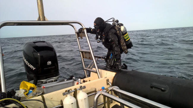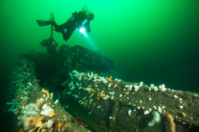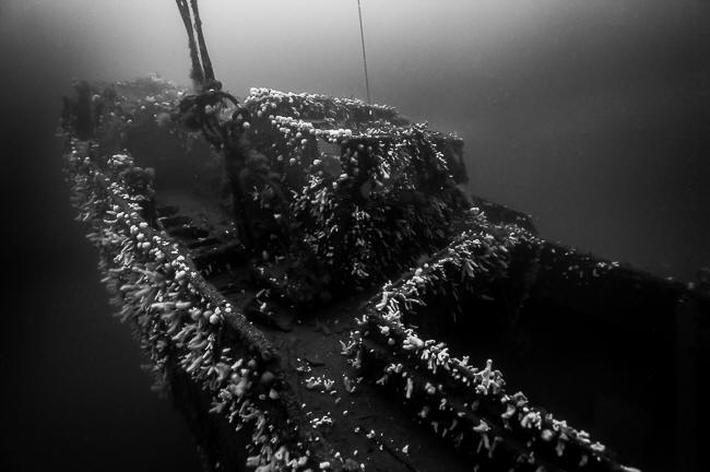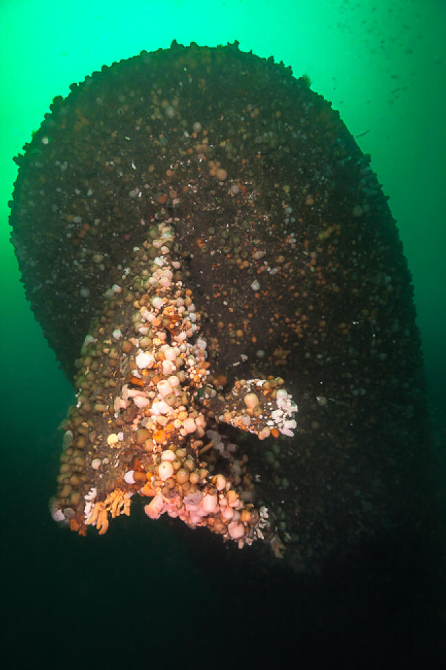 Til sidst fik vi et fast ekko og loddet blev smidt. Der var 32 m til bunden, så det var jo easy diving og Kasper kastede sig i vandet for at binde på og jeg kom lige efter bevæbnet til tænderne med kniv og harpun. Fra 14 m kunne jeg skimte Kasper nede på vraget i den dybe ende og kunne med det samme se at sigten var god. Det var dog først da jeg kom helt ned og kiggede op mod vraget på lavere dybde at jeg fik et dejligt kick.