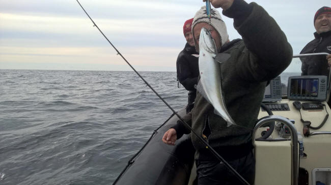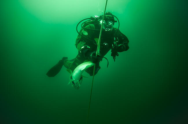 Det tog ikke lang tid til positionen og da vi havde dykket relativt lavt og havde procenter på flaskerne så kunne Kasper jages i med det samme. Vi nød dog lodskuddet lidt med hvad der så ud til en kæmpe stive sej over vraget, hvilket blev dokumenteret med fiskestangen. Pirken kunne ikke ramme vraget uden sejene hoppede på af sig selv. Jeg bad Kasper vente på mig, jeg ville gerne med ned og se med egne øjne den stime sej og ikke langt nede af tovet, Kasper først, stod der en massiv stime sej hen over vraget. Der var ikke helt så god sigt på første dykket, men alligevel en 4-5m. Vi lavede touchdown samtidig og Kasper og jeg blev mødt af en stor stime torsk der kom op fra vraget og ude fra bunden omkring vraget. Vi lå lige lidt der og nød synet hvorefter Kasper bandt på og jeg ladte kanonen og gik på jagt. Der var torsk overalt og de støvede desværre ret meget, nok derfor Kenneth var lidt skuffet over sigten. Der røg en masse mad i posen og min blodrus blev styret, samvittigheden intakt ved tanken om den store bunke is der var i båden, så fiskene kunne komme hjem i god forfatning. Kasper havde sågar også fanget sig en flot stor torsk, først troede jeg han ville forære mig den, Kasper spiser jo kun fisk der er færdigkøbt og helst paneret, men han trak den til sig da jeg tilbød ham plads i mit net.