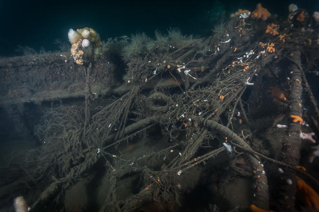 Stævnen på Nixe var faldet sammen, så nu var gulvet under bakken højeste punkt. Det lignede at et trawl havde haft godt fat i vraget for det meste lå samlet ude på bunden sammen med rupperlinen fra et trawl, men bortset fra det lignede vraget sig selv. Et spændende vrag med masser at kigge på og fyldt med kringlekroge der gemmer på noget at kigge på. Jeg lå et stykke tid og forundredes over hvor stort spillet til lastrummet var, det så helt fejldimensioneret ud, men sådan var tidens dampspil åbenbart på de gamle fiskefartøjer, for det ses også på de andre damptrawlere rundt omkring.
