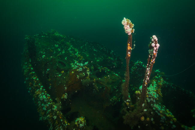 Der var dømt akvarievand og masser af dagslys på vraget. Korsar er lastet med stålruller og nede i lastrummet var der et mylder af liv. Masser af taskekrabber og flotte store torsk, hvor en enkelt hurtigt kom i posen. Mest spektakulært var det at glide udover agten og se ned på skrue og ror der stod 6m over bunden i frit vand og herefter lade sig glide ind under vraget og svømme under kølen en godt stykke før den mødte bunden. Kenneth kom også ned og havde sit kamera med og blitzen blitzede flittigt. Kasper så ud som om han fik sig en lur oppe på hækken, men han lå bare og nød den gode sigt og fordybede sig i myrimader af bittesmå søstjerner der var over hele agten. Piv fik også et godt dyk og bandt af, vi skulle jo videre i teksten.