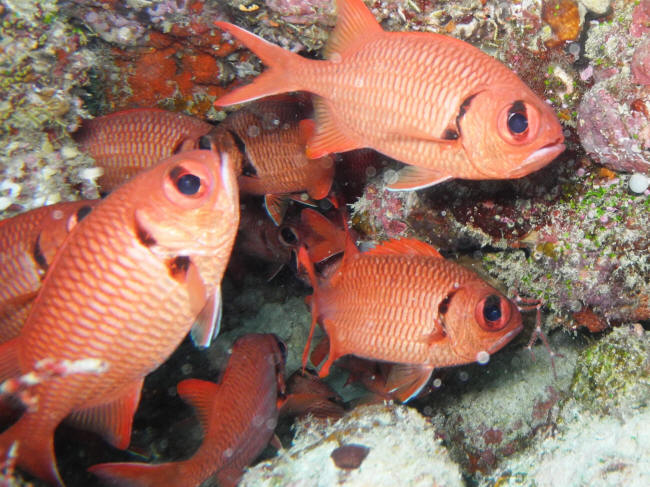 Efter dagens hårde program skulle vi også prøve, om vi kunne komme i vandet bag båden, hvis der kom mantaer og åd i projektørlyset. Der var mange både i lagunen, hvor vi lå (Fesdo Lagoon), så alene det, at en manta skulle finde vores båd mellem alle de andre tilbud ville være en stor ting. Der kom dog alligevel en manta og den slog fine saltomortaler bag båden, så vi kom i vandet. Vi skulle sidde på bunden i en rundkreds og lade vores lygter pege op. Bunden var leret koralsand, så sigten var, som når man dykker med en vragbasse på et mudderfyldt vrag, dvs ikke brugbar til ret meget. Mantaen(erne) lod vente på sig, så jeg blev hurtigt utålmodig og svømmede lidt omkring, der var egentlig lys nok til at orientere sig, og der var ikke meget liv ved de få koralblokke, der var. Efter trekvarter opgav guiden og så skulle vi op. Her var dykket højdepunkt, der var squids i vandet på 4-5 meters dybde, der fangede nogle af de rejer, der var tiltrukket af lyset. Tirsdag d. 18/11Vi startede med et tidligt morgendyk på Fish Head i kapløb med de andre dykkerbåde, Der løb en fin strøm, så vi kunne hænge i vores Reef Hooks, et ubetaleligt hjælpemiddel for en dykker på Maldiverne. Vi kunne hænge i kanten af revet og spejde ud efter hajer uden så meget som et enkelt spark med finnerne. Der var nogle pænt store grå revhajer og nogle skildpadder. Sigten var forholdsvis god og det gjorde ikke oplevelsen mindre!
