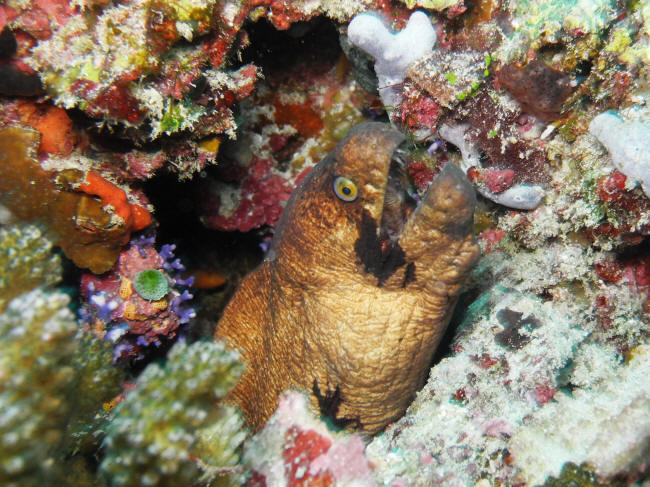 Fredag d.20/11Medhu Faru – den sidste udfordring med høje bølger og stærk strøm. Vi fik set en enkelt haj, en napoleonsfisk og et par skildpadder. Og så fandt vi et interessant hjørne, hvor der var mange fine ting at nærstudere, og pludselig var der en lille hidsig muræne, der gjorde udfald. Den fik ikke fat i noget, men det opfordrede jo næsten til drilleri, og så kom der pludselig en til frem af et hul. Meget morsomt, når de ikke får fat!
