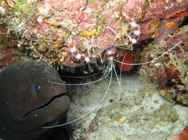 Vi drev videre rundt og op på det lave, igen meget fint sted og nogenlunde strømlæ. Her lå en skildpadde og der var en fin muræne med et par pudserejer som selskab. Vores time var ved at være gået, så vi fik sendt ballonen op.