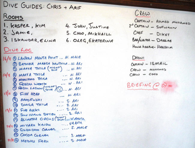 Lørdag d. 15/11Vi blev vækket ca. en halv time senere end det, de havde sagt de ville, men vi kom ret hurtigt ned i bussen og af sted til lufthavnen, hvor vi igen blev ledt ind ad bagdøren, for vi havde jo i princippet slet ikke været ude. Sikkerhedstjekket gik meget hurtigt og snart efter sad vi en halvtom maskine mod Male. Heldigvis var der flere tomme stolerækker, hvor vi kunne ligge ned.  8-9 timer senere landede vi i Male. Vi kom overraskende hurtigt igennem immigrations- og toldbehandling, og guiden fra båden – Chris- stod klar til at modtage os. Han fik samlet dem, der skulle med os til båden, det var tre russere Ekatarina, Oleg og Mikhaill, der var med samme flyver som os, og et par englændere Justine og John. Vi blev sejlet ud til M/V Emperor Atoll, der husede de sidste gæster – det var yderligere et par russere Elina og Iskandar, en brite af asiatisk oprindelse ved navn Choo og Jamie, en kineserpige fra New York, der boede i Australien. Efter en kort introduktion, hvor vi skulle vise vores certifikater, var vi clearet til aftensmaden, der i bedste Maldiviske(?) stil var asiatisk/indisk inspireret og meget velsmagende.Søndag d. 16/11 Check-dyk skulle ske ved 7-tiden på Lankan Manta Point, og der var vækning kl. 6:00 for dem, der ikke stod op af sig selv! En kort briefing senere kom vi ombord på Dhonien og fik sat vores grej sammen, så godt det nu kunne lade sig gøre, når det ikke passede helt. Men vi kom i vandet, relativt ordinært til at starte med, bortset fra de 29 grader i vandet, men kort efter kom den første manta og så endnu en og så en million dykkere.