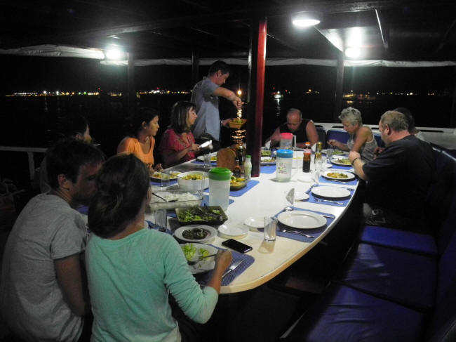 Tilbage på båden skulle vi lige igennem endnu et lækkert måltid inden aftenshowet begyndte. Først en og siden to mantaer slog saltomortaler i projektørlyset bag båden, hvor de åd af det plankton, der blev tiltrukket af lyset. De kom helt hen til båden og op i og over overfladen. De legesyge fisk fornøjede sig i flere timer, og vi blev trætte før dem.