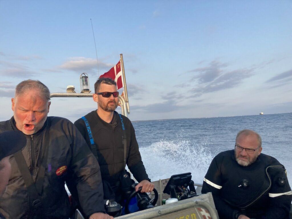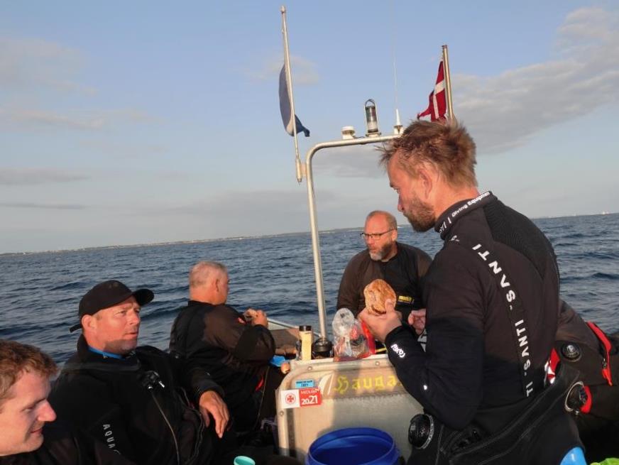 Da vi kom op i båden skulle jeg naturligvis høre på hvordan 2. mand i vandet havde frosset med el-varme i tørdagten, mens jeg stadig stod og små rystede efter dykket i en 5 mm våddragt. Herefter blev der også talt en masse om alt det ammunition der lå på bunden, hvilket var meget sjovt for jeg havde slet ikke bemærket det, da jeg havde meget travlt med at se på fisk og krabber.
