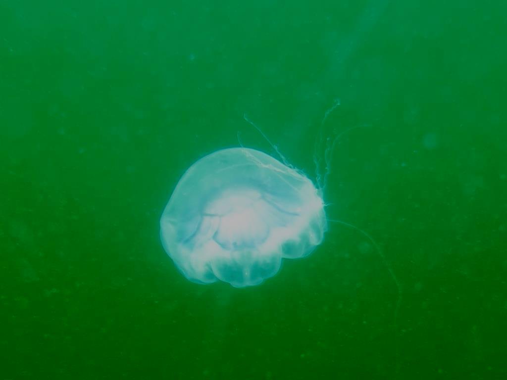 Herefter en rundtur på bunden, hvor sigten var lige så ringe (det ville være god sigt på Robert). Der var ikke mange fisk, men der var dog nogle torsk og langer inde under vraget helt bag til. Ellers var det buskhoveder, åbne sønelikker og flagrende tråde af nøgensnegleæg (tritonia), der nærmest dækkede hele vraget. Og i kobberrøret på broen er der igen taskekrabber…