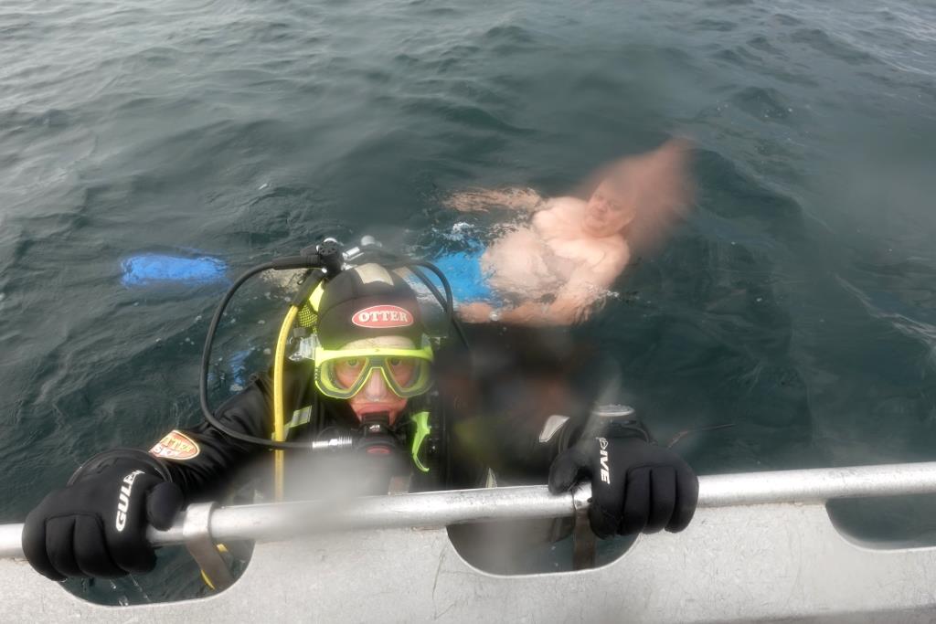 Jeg var første mand oppe ved Jørgen i båden, hvilket jeg naturligvis godt vidste, for jeg havde mødt de andre på vraget, og Jørgen benyttede sig af chancen til at hoppe i havet. Karin var oppe lige efter mig og Juhl var ikke længe efter, det er nu praktisk at alle kan dykke ca. samtidigt.
